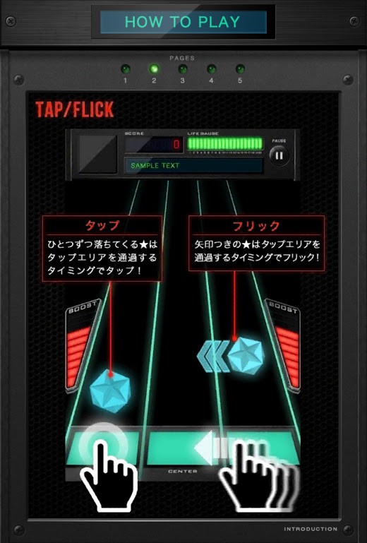 ノートの種類に応じて「タップ」、「フリック」するとハイスコアが狙えます。連続で成功するとコンボとなり、ブーストが発動してスコアアップにつながります。