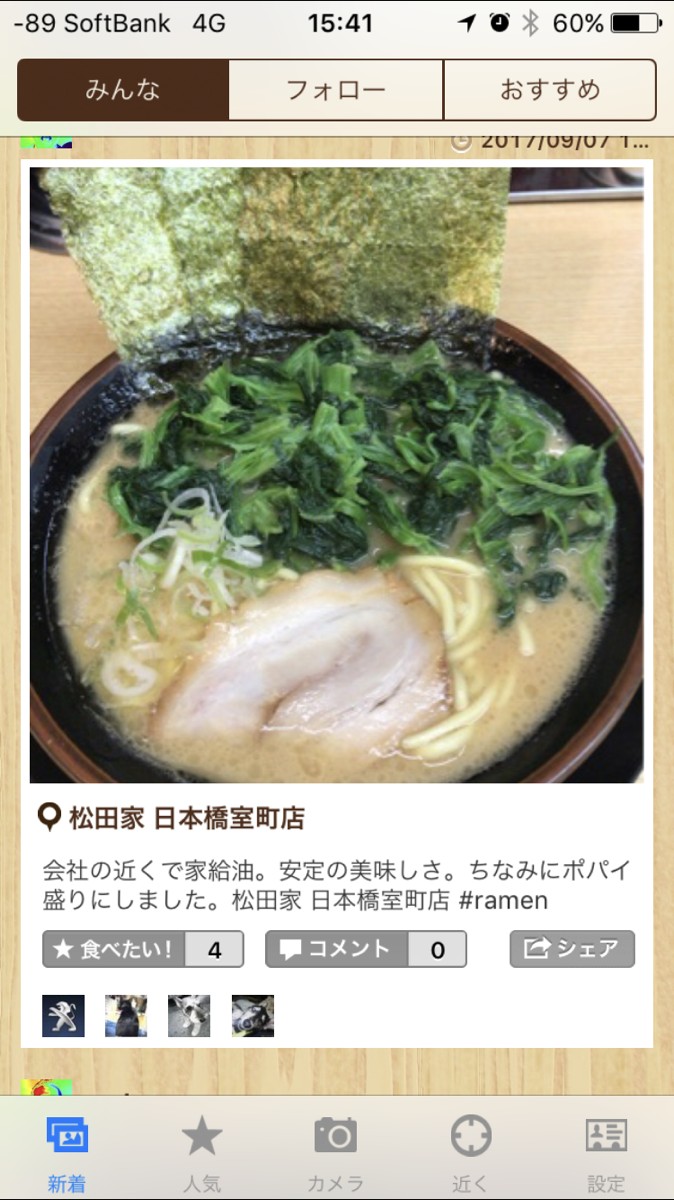 以下のような手順で、「Spoon! グルメ/ランチの美味しいメニュー共有・検索」を使って気になった写真をチェックしてみました。