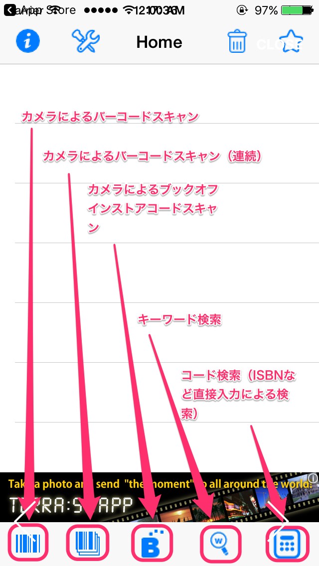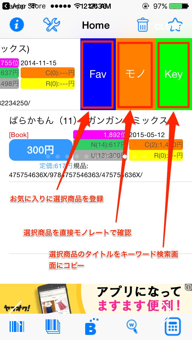 画面下部の虫眼鏡マークではISBN、JAN、UPCの直接入力による検索やカテゴリ別に絞り込みができ、さらに商品の検索が簡易になります。