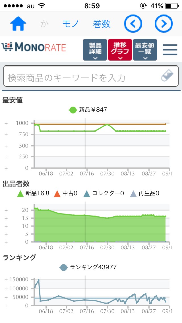 表示された商品をタップするとAmazonでの詳細を見ることができます。画面上部にある「モノ」をタップするとモノレートで相場のチェックが可能です。商品情報、出品者数、定価、最安値、ランキングが見やすく表示されています。「巻数」をタップすると、マンガの巻数の簡易チェックができて便利です。