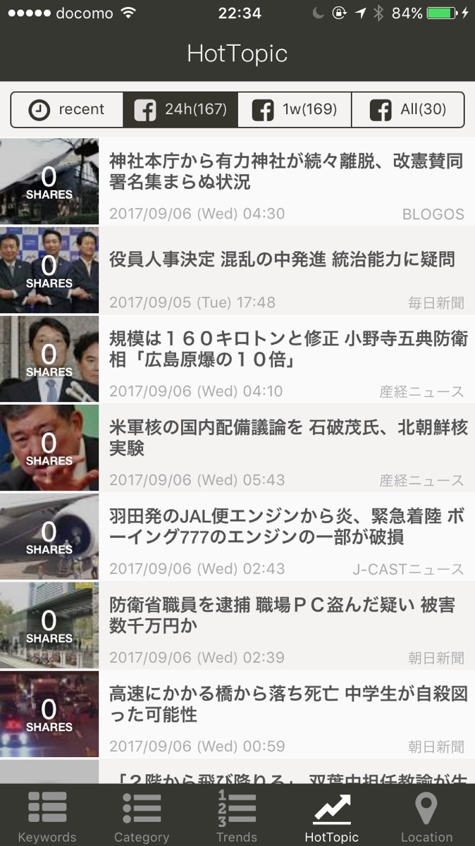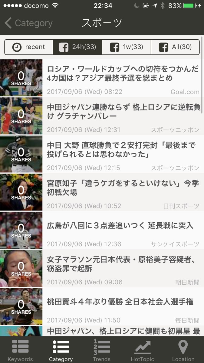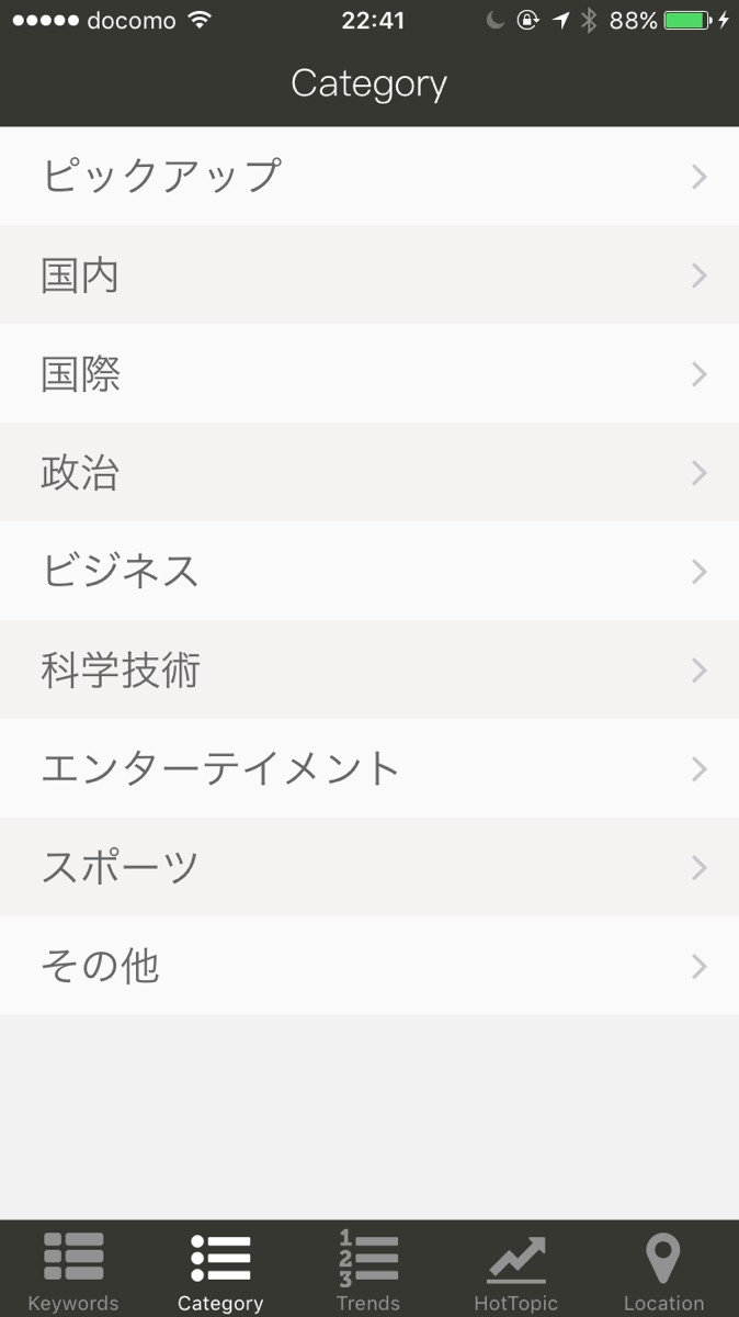 「Keywords」は、appleyやmac、iPhoneのキーワードがあらかじめ設定されていてそれに関連した記事を閲覧することができます。「Category」は、ピックアップ、国内、国際、政治、ビジネス、科学技術、エンターテイメント、スポーツ、その他のジャンルに分けられているので、気になるものをタップしましょう。「HotTopic」は、話題になっているニュースが集められています。