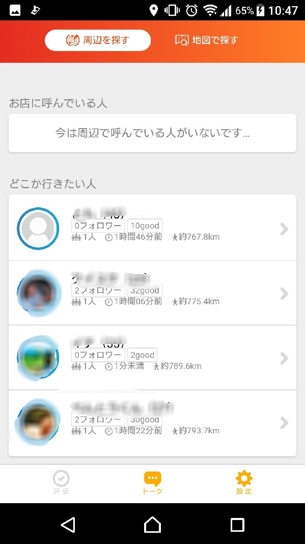 というのが、出会うまでの流れになっています。今回は、「どこか行きたい」を選択してみたのですが、すぐに相手がみつかり、トークまですすむことができました。チャット機能も、LINEと同じように使えるので、スムーズに連絡が取れます。とても簡単ですよね。「誰か呼びたい」を選択した場合は、行きたいお店と時間を決めて、呼びかけることができます。ぜひ、参考にしてみてください。