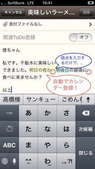 ・日付の後ろに「、」を入れるだけで送信後に自分のカレンダーに、受信した場合は送信相手を承認した後にカレンダーへ自動登録してくれる