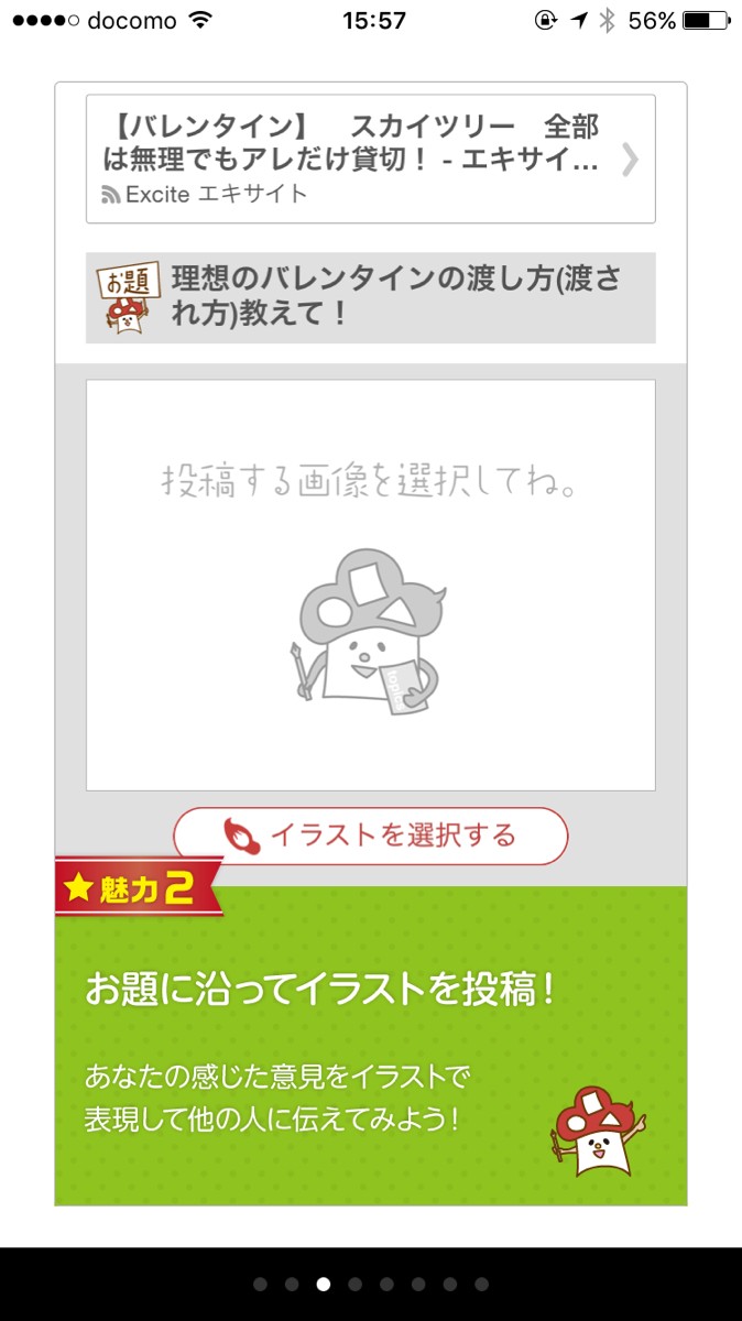 トピックをタップして、赤い筆のマークのアイコンを選択します。カメラロールから取り込む必要があるので、イラストはあらかじめ携帯に保存しておきましょう。