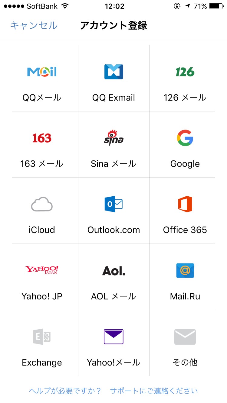 「MailTime」が対応しているメールアカウントは多岐に渡ります。office365、Gmail、yahoo mail、iCloud、AOL、Hotmailなどなど。