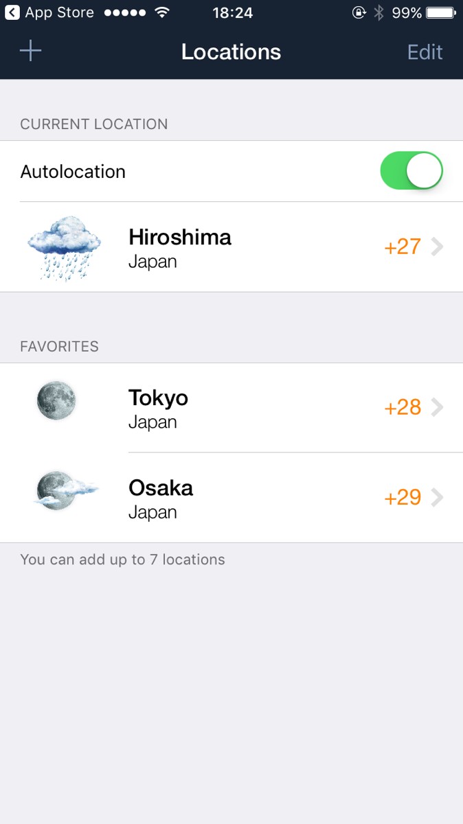 別の地域を追加登録するには「Locations」画面では左上の「+」ボタンを、「Current location」画面では右上にある検索ボタンをタップしてください。そこから都市名を入力し、登録をします。