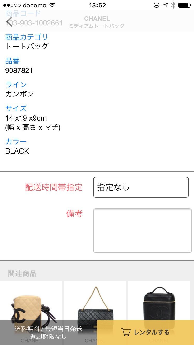 更に商品の詳細「確認する」をタップすると、品番、具体的なサイズなどが表示されます。画面下部には「関連商品」として他のバッグも紹介されていますよ♪