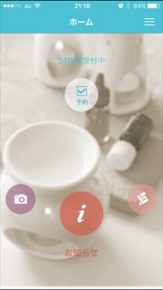ホーム画面上には、エステの予約ボタンがあります。画面下を横にスワイプして回していくと「お知らせ」、「配信クーポン一覧」、「サロン一覧」、「Photo Box」の各ボタンが表示されます。