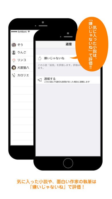 ・読んだ小説が気に入った場合は、「嫌いじゃないね」ボタンをタップして評価をしてみましょう。物語の続きを自分が書きたい場合は、画面右上の執筆ボタンをタップすると、その続きを書くことが可能です。