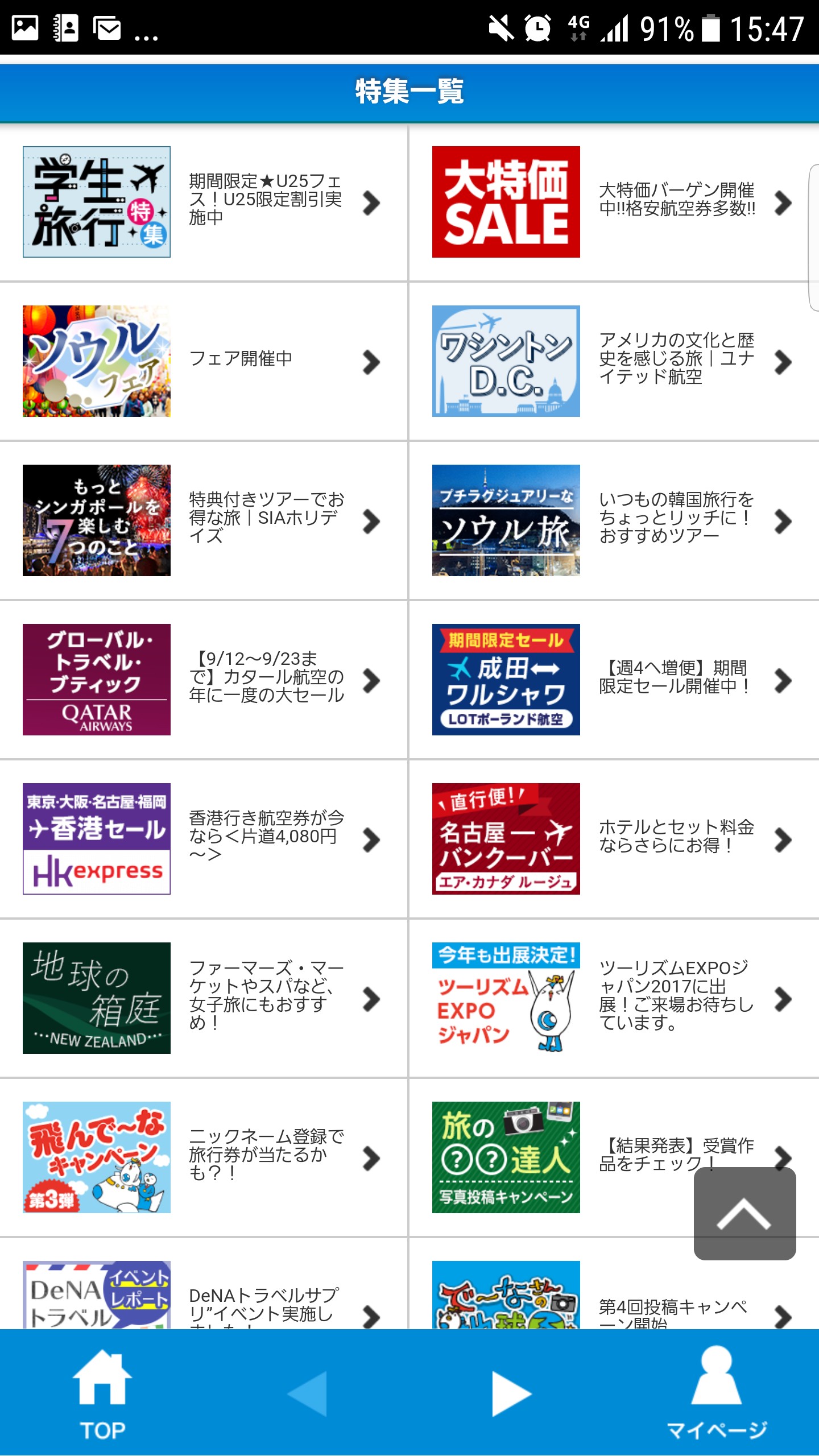 筆者が特におススメしたい本アプリの特徴は、「特集」という通常よりさらにお得になったプランがあるということです。例えば「学生限定」や目的地別の特集では「ホノルル」や「ワシントン」など、とにかく安い!というのは「大特価セール」や「タイムセール」など季節や目的地限定の大目玉プランが多数あります。何か裏があるんじゃないの?っと思われている方・・・まったくありません!ですが強調して言うならば、需要と供給のバランスでお安くなっていたり、旅行日程が結構先か逆に早い日程となっているかという点です(基本は通常の予約となんら変わりません)。ですが例えば「来月に一週間ほど休暇を取得していたが、予定がキャンセルとなってしまい、せっかくの休暇だからどこか旅に出たい!」そんな方には、この特集から通常よりさらにお安く、自分に合った最適な旅のプランに出会えるチャンスがあります。