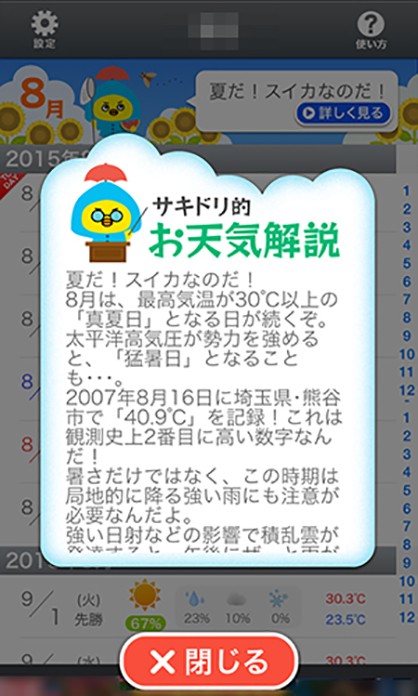 追加的な機能として、予報士の地方別、月ごとの天気傾向をキャラが可愛らしくかいせつします!ちょっとした豆知識的な読み物として御覧下さい。