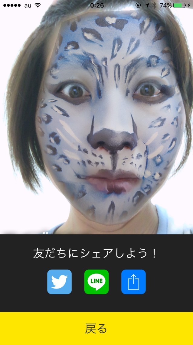 このような手順で簡単に撮影することができました。手順5のあとで「友達にシェアしよう!」という表示がされ、ツイッターやラインのほかSNSなどで共有することができます。「戻る」ボタンを押せば、再度撮影画面に戻ることができます。前髪がおでこにかかっているとうまく認識されないこともあるので、撮影するときはおでこを出してアップで撮影するのがおすすめです。