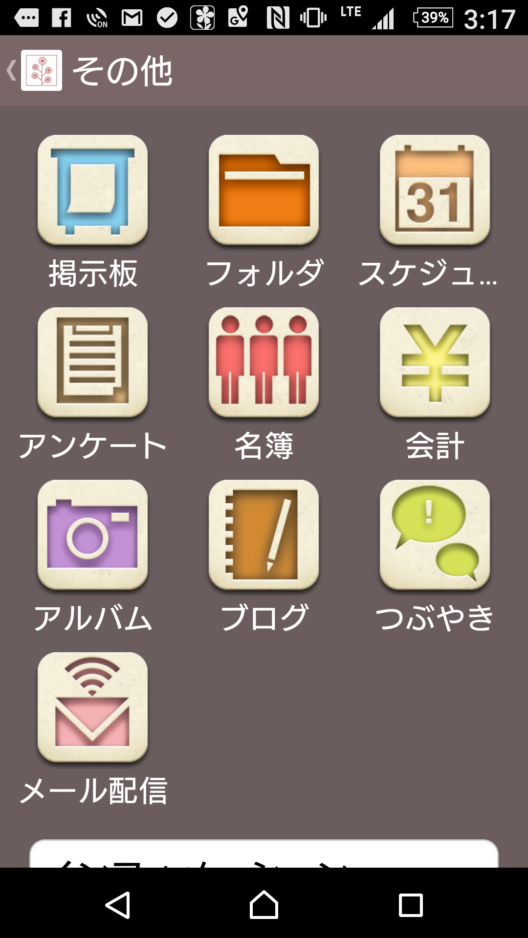 スケジュールの出欠管理、アルバム、フォルダ、ブログ、つぶやき、掲示板、メール配信、アンケート、ブックマーク、インフォメーション、名簿、ホームページ、活動場所、会計、管理者機能、ブループ機能と、16種類のカテゴリー別に使用できます。アプリ内で、団体のホームページが作成できたり、会計機能で収支管理ができるので、サークルで使いはじめると手放せなくなる必須アプリになりそうですね。