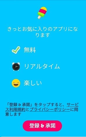 このアプリの登録方法から説明していきましょう。アプリをインストールするとアイスクリームバーのショートカットがスマートフォン画面に現れます。そのショートカットをクリックすると登録&承諾ボタンの画面が現れますので順を追って登録&承諾していきましょう。ボタンをクリックするとお名前は?と書いてありますので名前の入力、矢印に従ってあなたの誕生日は?入力して矢印へあなたを特定するために、電話番号が必要です。国番号を選択し携帯番号入力し矢印へ、どこにいますか?は、現在地ボタンを押しましょう。GPS機能で現在の場所を検索してくれます。友達を見つけましょう!は、友達ボタンをクリックして自分の連絡先から友達を招待しましょう、ここまでで登録はおしまいです。友達からの承諾を待ちましょう。