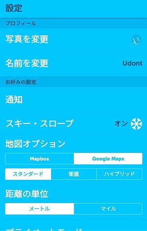 設定ボタンを押すと設定画面になります。プロフィールでは、写真や名前の変更できます。お好み設定の通知では、友達が海外に行ったときや電話機の連絡先の登録してる人がこのアプリを始めたとき、誰かがあなたの位置を調べたときに、通知するか?しないか?が選べます。スキー・スロープをONにしておくとスキーに家族や友達と行ったときに、山の画面がでて山のどの位置位に居るかが分かるようになります。この機能は、家族や友達、恋人とはぐれても山のどの位置位に居るかが分かる優れものです。その他プライベートモードを有効にしておくことにより電話機の連絡先の登録者がZenliyをインストールしたときに交流ができるようになります。その他、地図オプションや距離単位を選べられます。