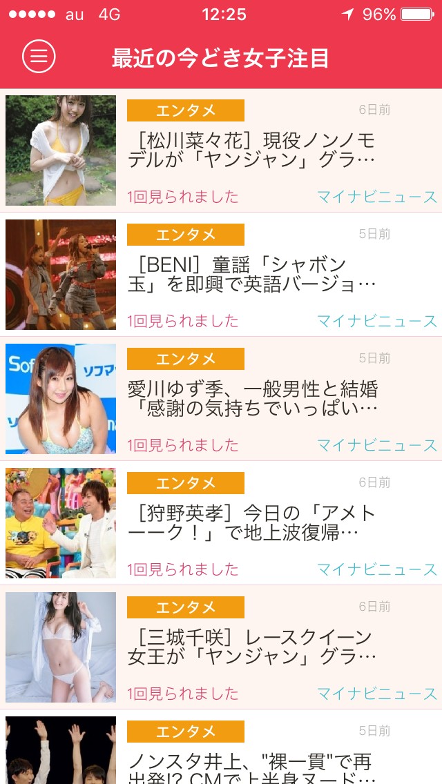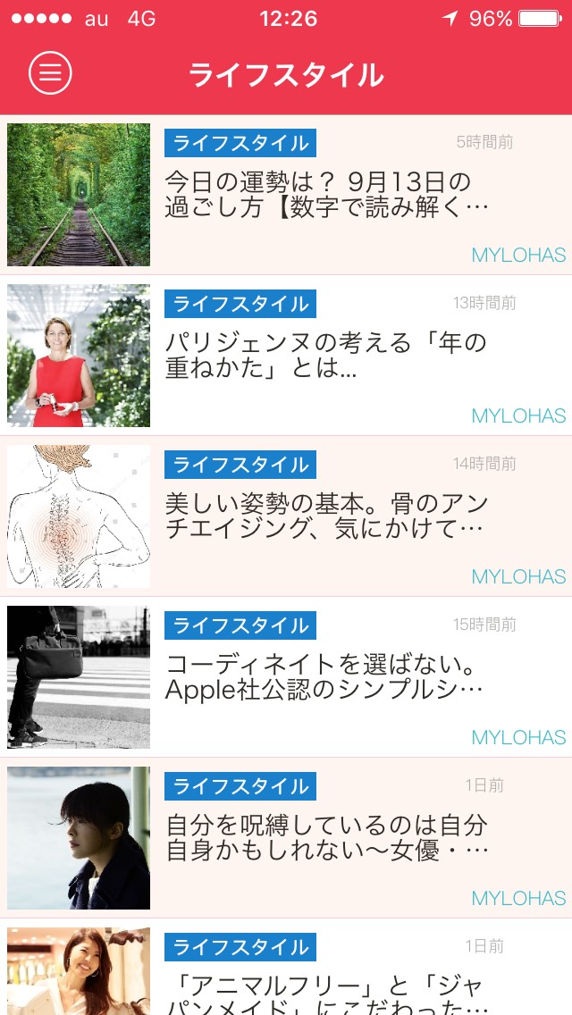 画面を左にスワイプするとメニューが表示されるので、気になるジャンルをタップすると記事一覧が表示されます。