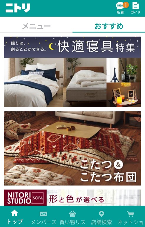 このアプリでは、ニトリのおすすめ情報をチェックできたりネットショッピングをすることができます。