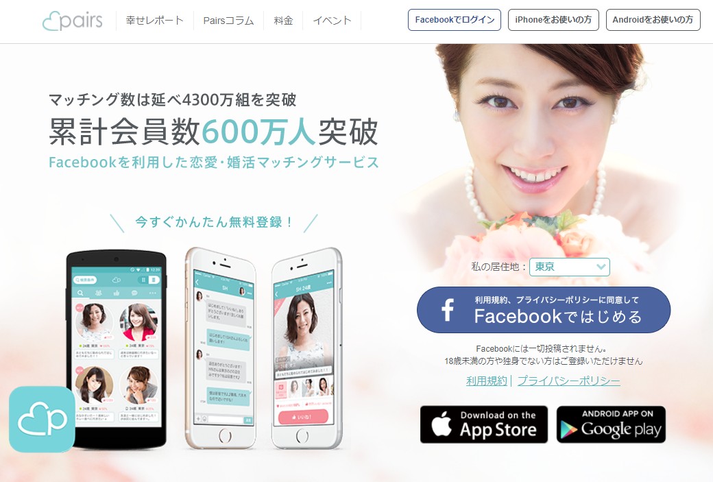 「ペアーズ」は、TVや雑誌でも取り上げられ、高い地名度を誇る出会い系アプリ。国内最大の登録ユーザー数を誇り、配信開始から約5年半経った今、4300万組以上のカップルが誕生しています。人気のアプリというだけあって、安心、安全に利用できるサービスが充実しているのもこのアプリの魅力です。