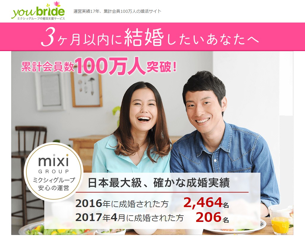 mixiグループが運営する「youbride」は、サービス開始から10年以上続くアプリです。累計会員数も100万人を突破し、年間約2500人ものカップルが結婚しています。ユーブライドでは、毎週のように婚活パーティーも開催していて、ネットでの出会い、リアルな場での出会い、両面から最良のパートナーを探すことができます。