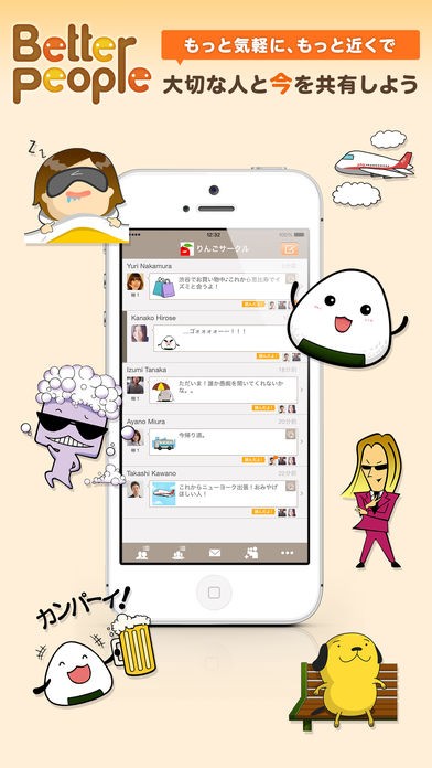 簡単で便利に使える「Better People」は、ゆるキャラなどのアイコンも使って、楽しく会話できるSNSアプリです。ぜひ、大切な仲間や恋人、遠く離れた友人などと、楽しい時間を共有し、より良い関係を築いてください。
