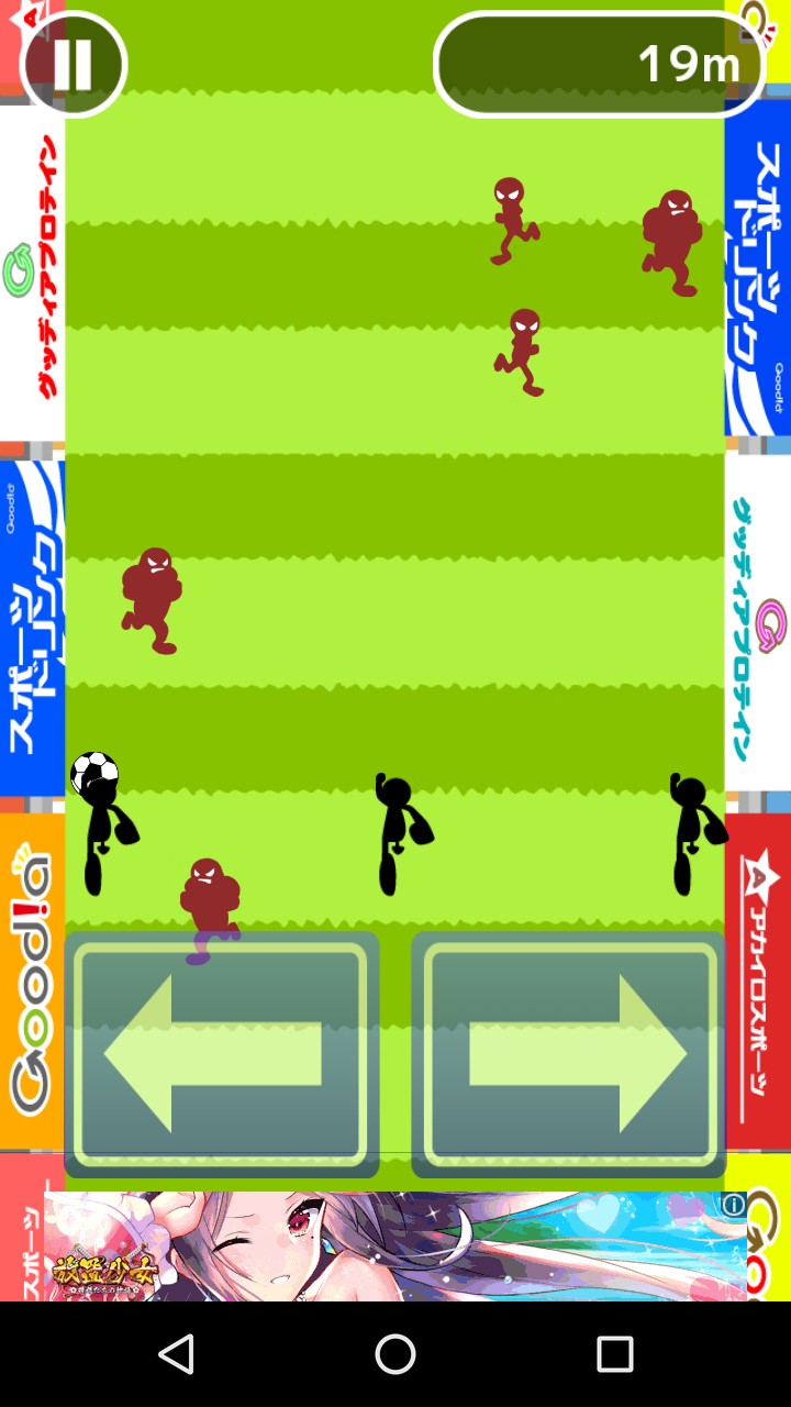 画面の左をタッチすると左にパス、画面の右をタッチすると右にパスを出すことができますので、パスで敵をかわして進んでいきましょう。