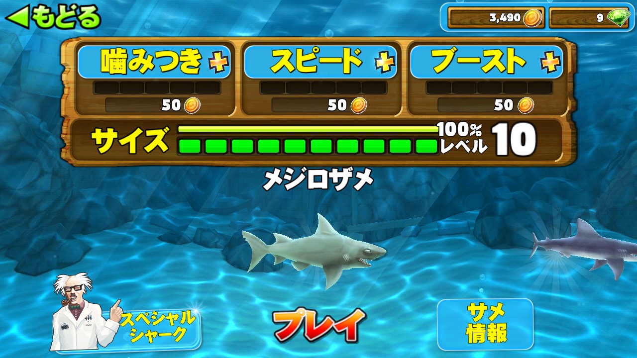 マップが広大なため探索しているだけも楽しいですが、ポイントがたまりレベルがMAXになると次のサメを開放することができるようになります。