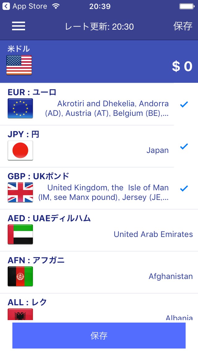 右上[通貨選択]を押すと150以上の通貨が出てくるので、使いたい通貨にチェックを入れ[保存]を押します。