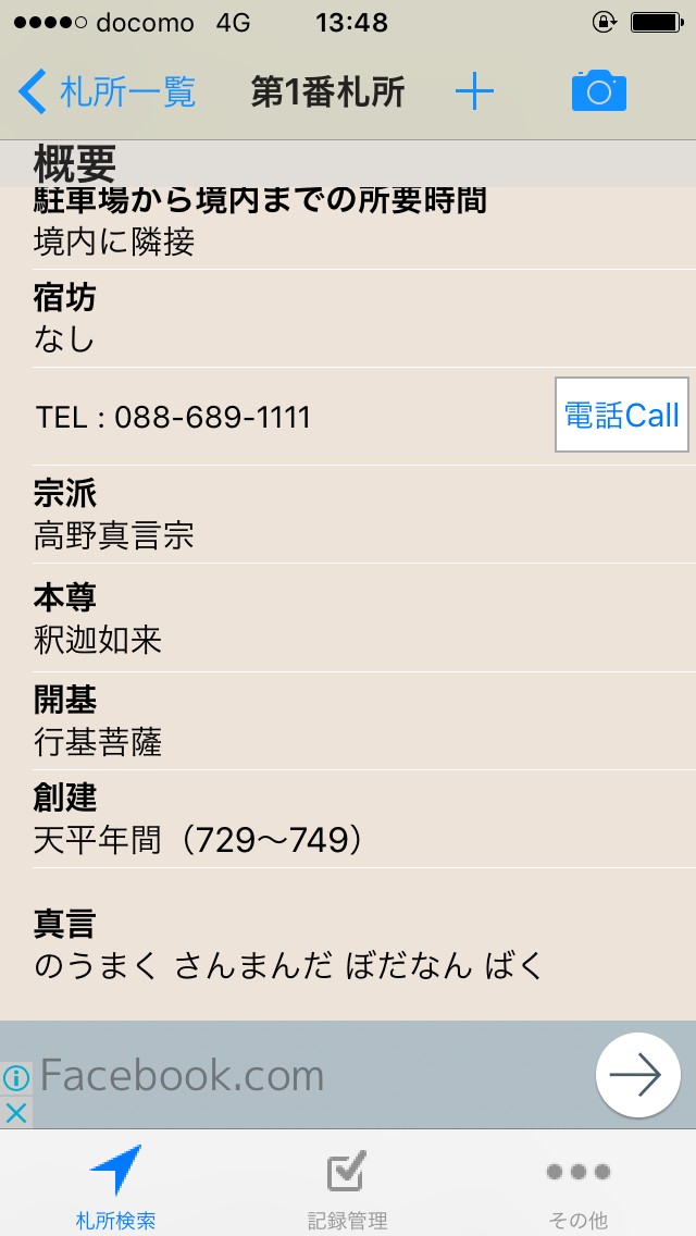 電話番号(ワンタッチで電話がかかる機能付き)、宗派、本尊、開基(寺院を作った人)、創建(建てられた時期)、