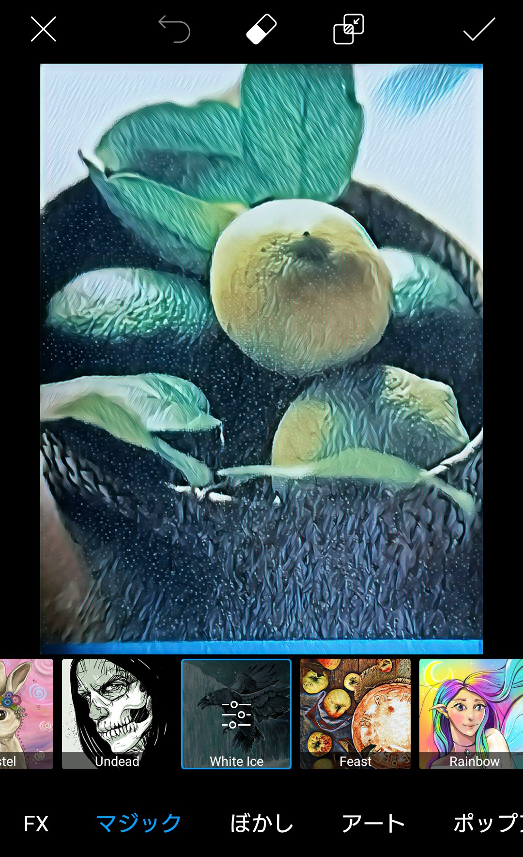 - 気に入ったエフェクト画像が完成したらチェックボタンを押して保存します