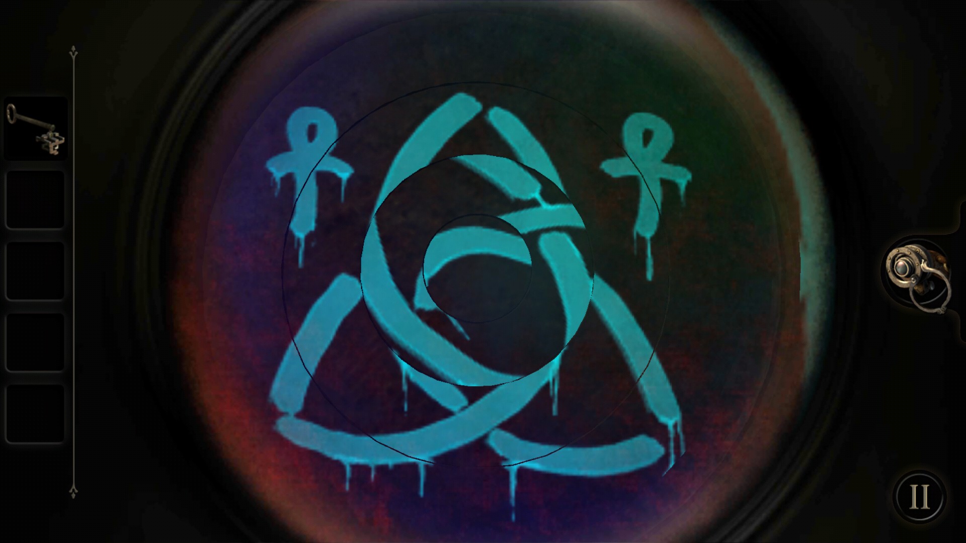 鍵を使いこなせれば、主人公のセリフを頼りに割りと簡単にアイピースのレンズを見つけることができるはずです。レンズをつけたアイピースを覗き込むと、箱や箱の周辺に書かれている錬金術の跡を確認できるので、正しい絵柄や図形に直してあげることで謎を解いていくことが出来ます。