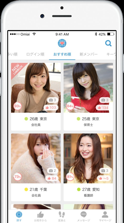特徴:20代前半から30代前後の、結婚に前向きな妙齢女性が揃っています。大学生もいれば、容姿端麗な人が多いCA、受付や秘書、やさしいイメージの看護師や保育士も登録しているなど、男性が好きな職業タイプにおいてバラエティに富んでいます。新聞、女性誌、雑誌、インターネットのサイトなどへも掲載歴が多く、信頼性のおける婚活アプリです。また、Appleストアでは、無料アプリでランキング1位になった実績もあります。会員数が多く、マッチング数の多さも魅力です。