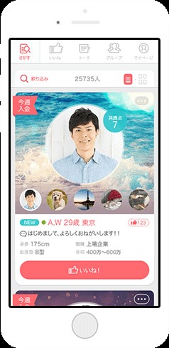 特徴:ミクシィグループの運営ですが、匿名性が保たれていて安全です。珍しい女性主導型で、女性からしかアクションができないので、婚活アプリ初心者でも安心して使うことができます。会員は10~20代が多いので、遠く結婚も視野に入れながら、まずはしっかりと恋する相手探しをすることに適したアプリです。ゲーム感覚で、空き時間を使って気軽に始めることができます。