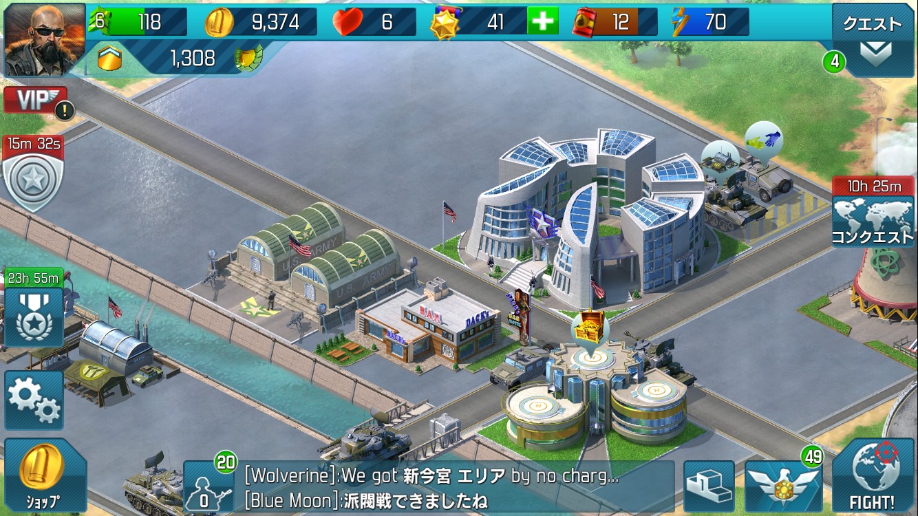 闘いを挑むには油が必要なので、基地の油田からこまめに回収しておきましょう。戦争は主に「FIGHT」と「クエスト」から行うことができます。まずはクエストを進めるのが一番ですが、「FIGHT」でほかのユーザーを闘い侵攻し相手のアイテムを横取りすることも可能です。