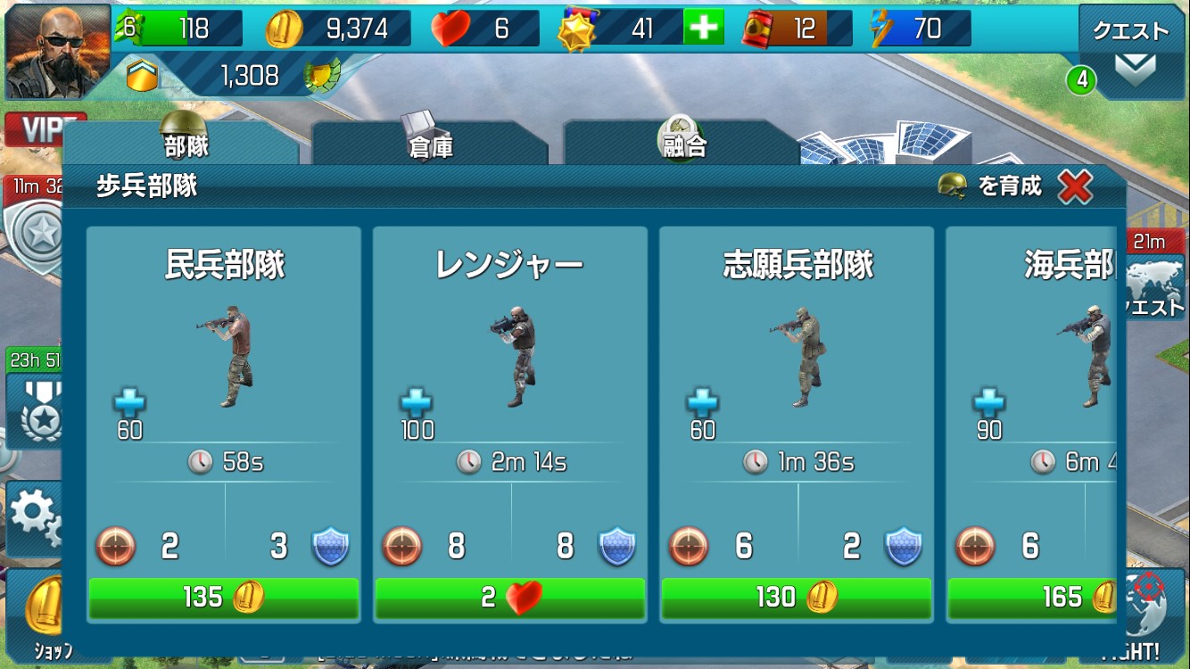 軍隊も基地でお金で購入します。序盤なら海兵隊などを購入することができますが、海兵隊は165ゴールドと6分41秒の時間がかかります。自分のレベルが上がるとより強い部隊を購入可能となります。レベル38まで上がるとロボット兵も購入が可能です。