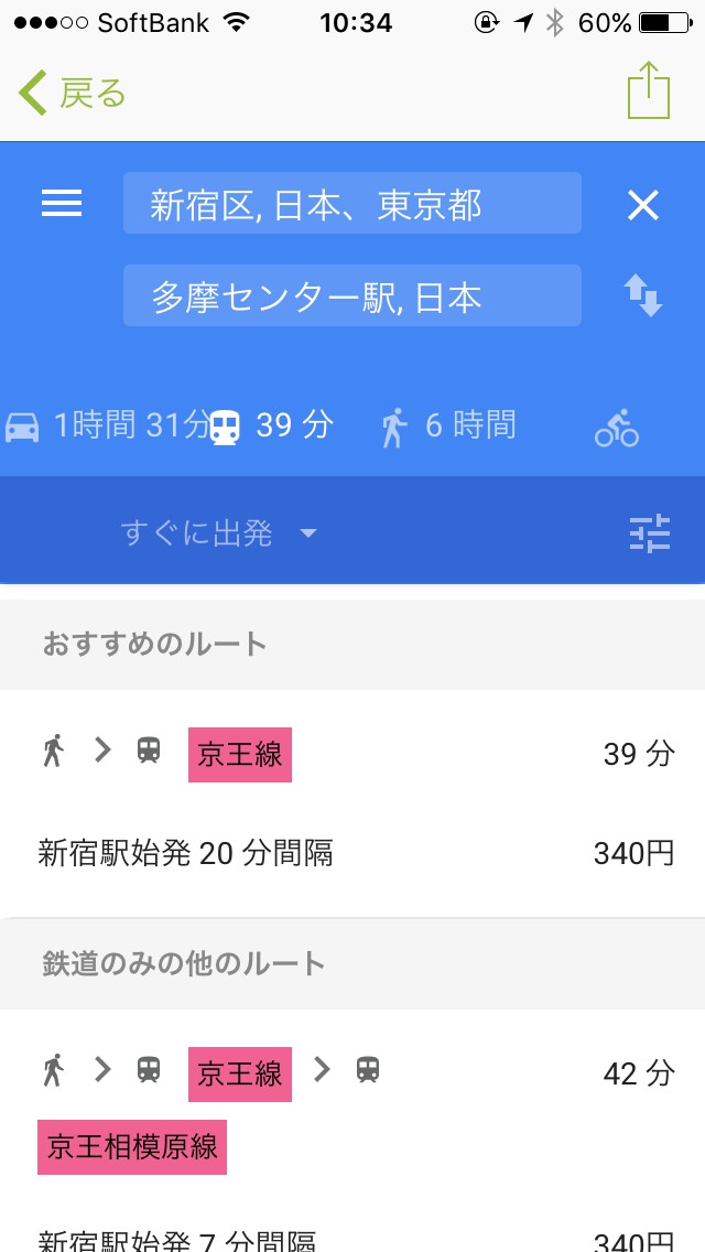 また、「Google map」がベースになっていて、「電車検索」もルート検索の中に増えました。これはビジュアル的にGoogle mapのものだと思いますが、まあ便利です。