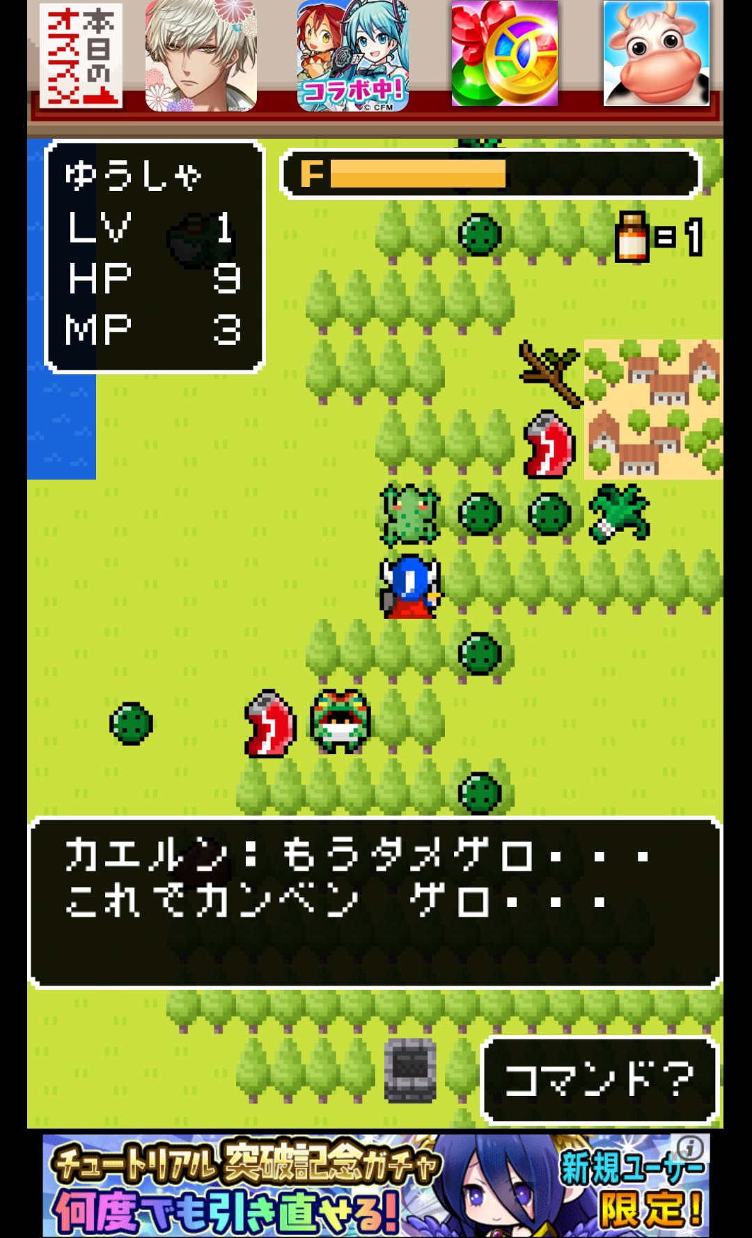 HPは時間の経過で回復するので、休憩するのもいいですし、コマンド?の「おひるね」をタップすれば動画を視聴することでも回復できます。