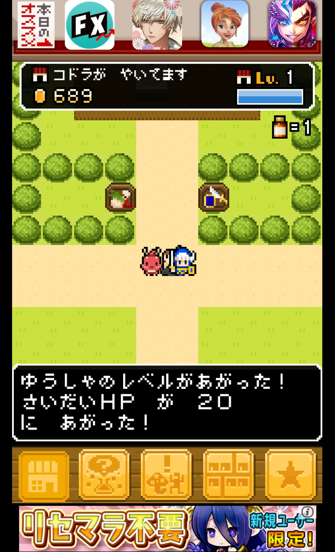 お店の売り上げが金額が一定額に到達するとお店と勇者のレベルがアップしますが、勇者は弱いままです。