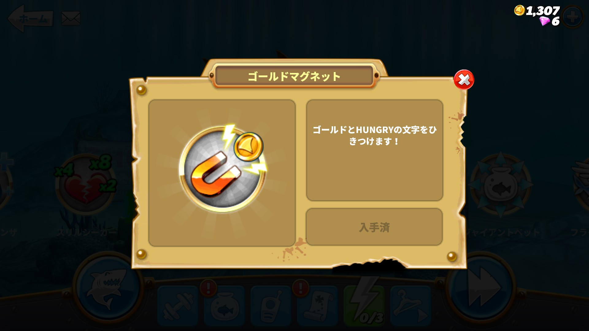 アプリTOP画面水槽のマークをタップするとサメのペットを購入できます。ペットにはそれぞれペットが捕食するとポイント2倍などの効果があります。