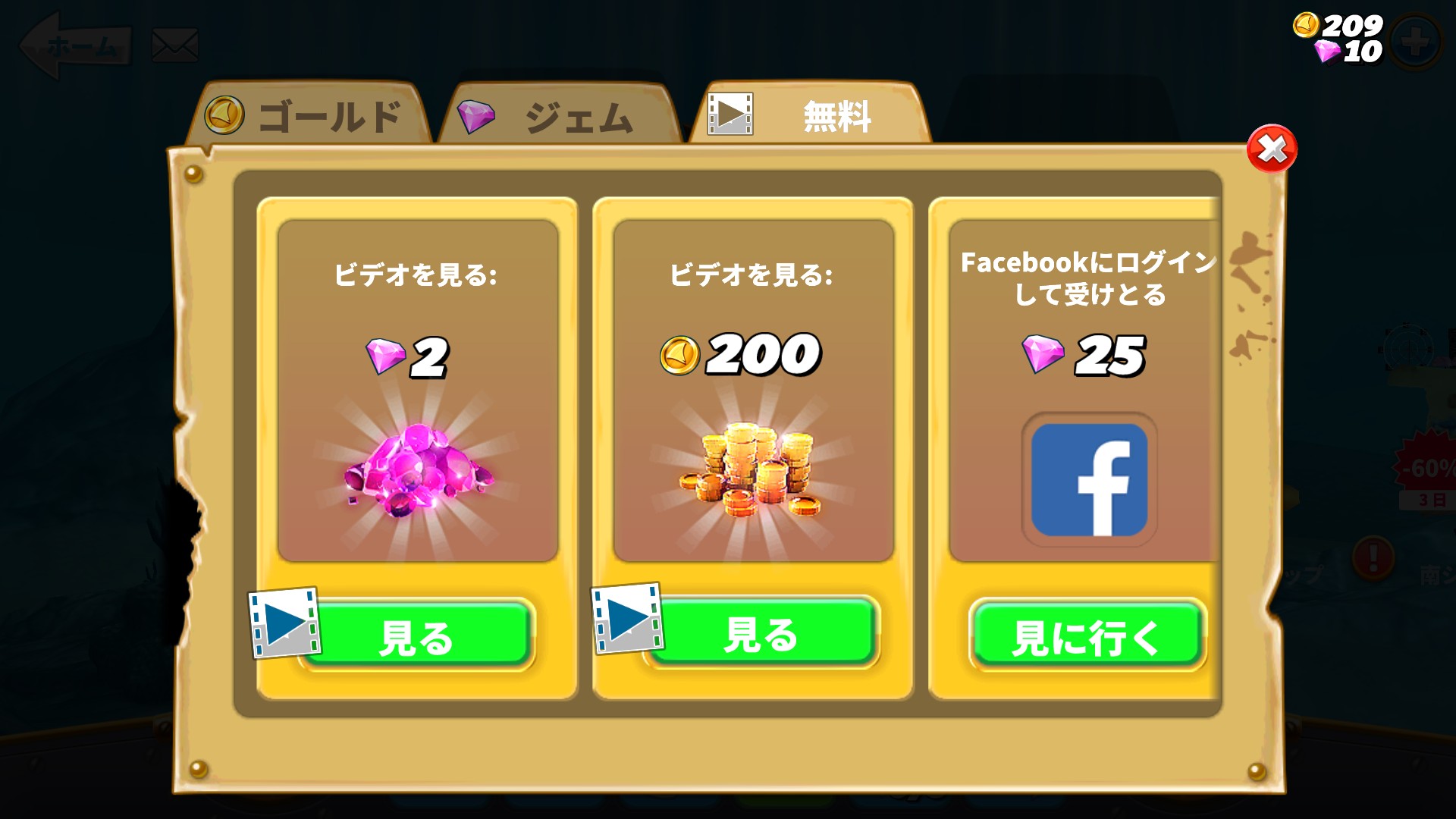動画広告を見ることでそれぞれ ・ジェム2個 ・ゴールド200がもらえたり。