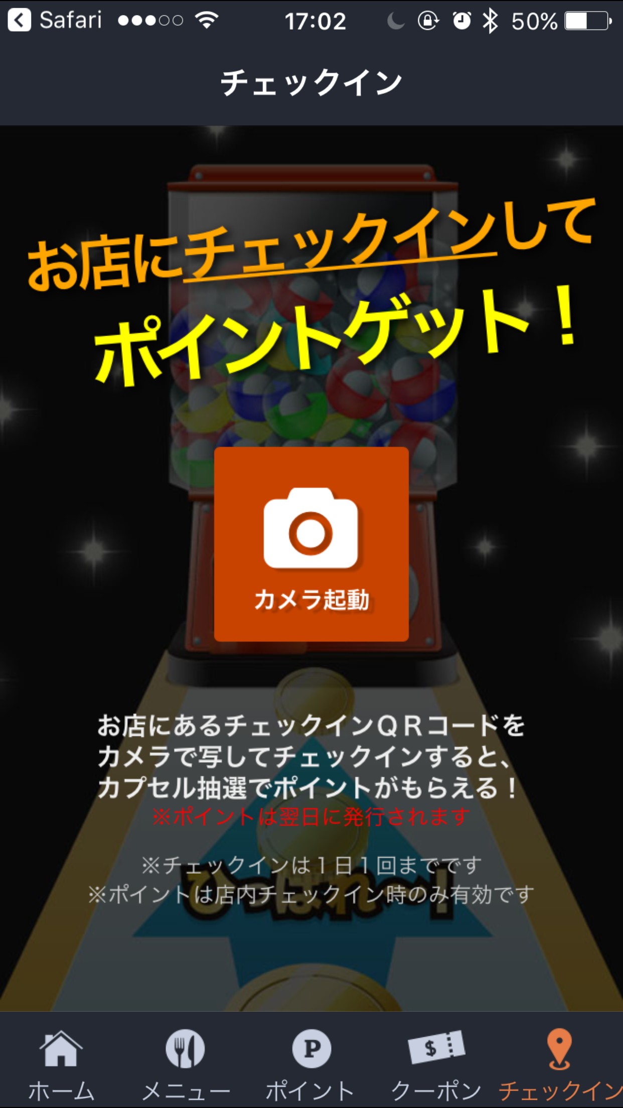 ポイントを貯める方法はアプリの「チェックイン」をタップして画面の「カメラ起動」をタップし、