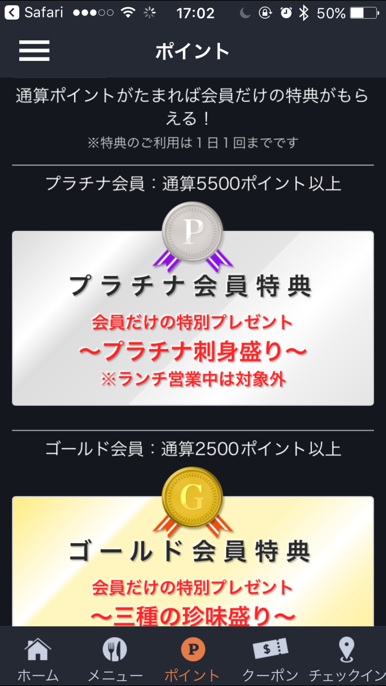 ポイントを貯めると「シルバー・ゴールド・プラチナ会員」と、会員ランクがアップしていきます。