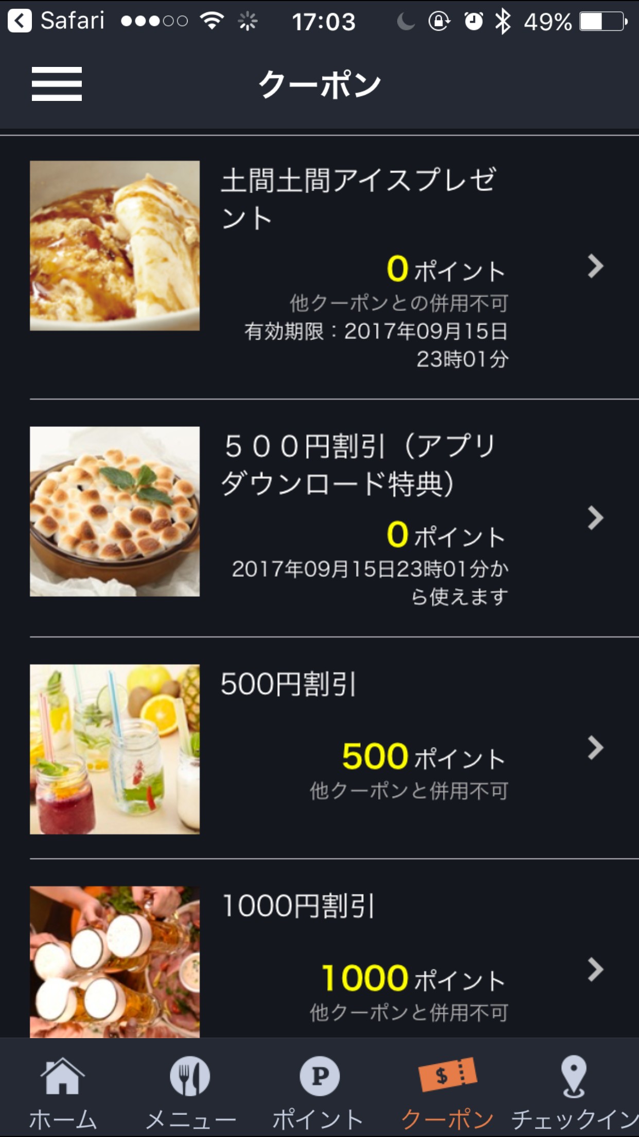 「土間土間公式アプリ」を使ってチェックインしたときにはポイントをアプリで貯めることができます。