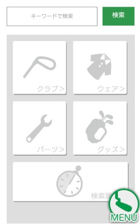 ゴルフ専用フリマアプリ「golfpot」で出品されているゴルフ用品を購入する場合、ホーム画面のメニューから[商品検索]アイコンをタップします。