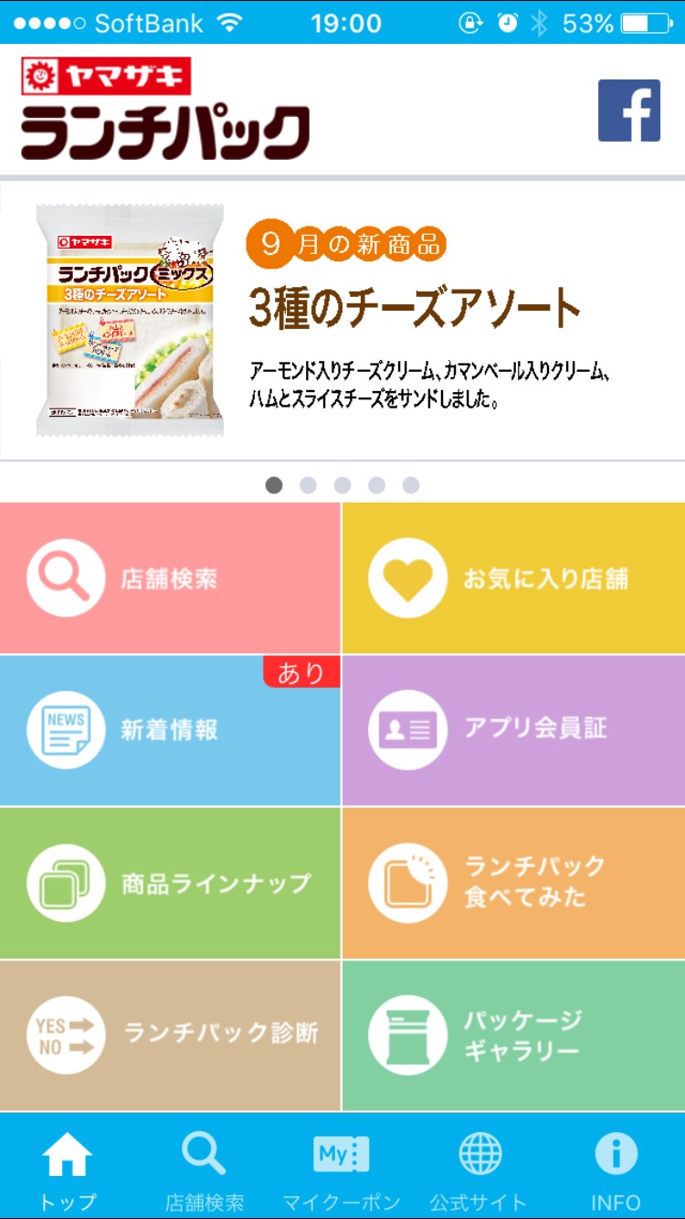 右上の【f】マークをクリックすると、ランチパックのFacebookへリンクされます。Facebookを利用されている方は、こちらも利用すればさらにランチパックの深い情報を得ることができるかもしれませんよ。