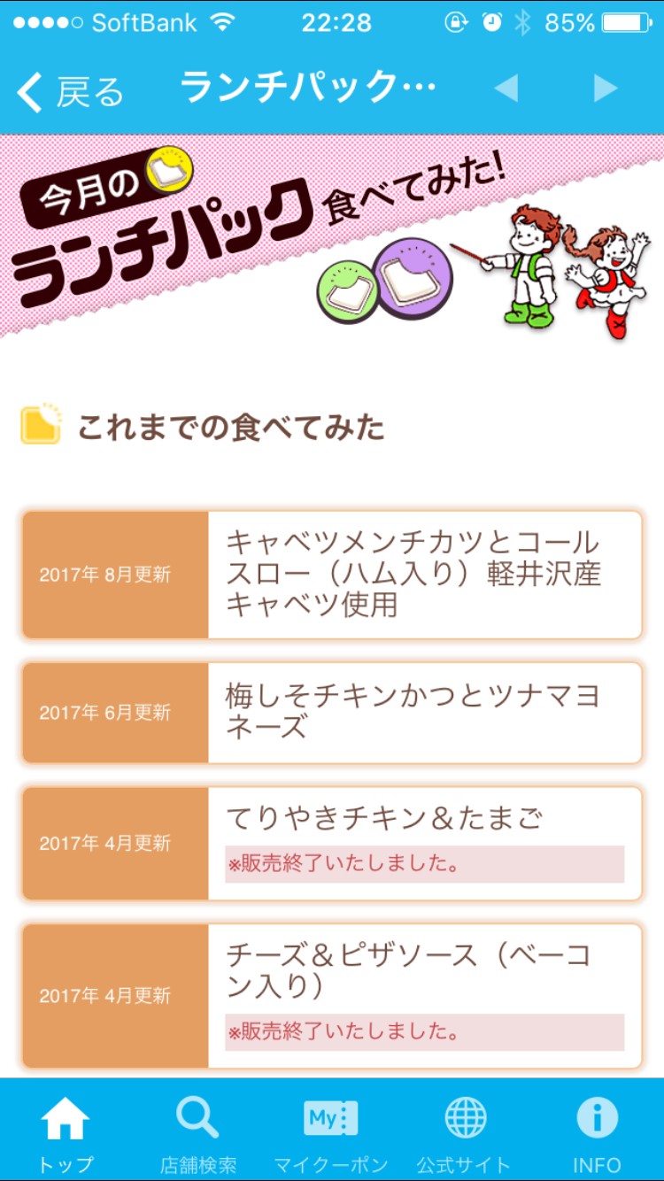アプリを立ち上げると、アプリ上部にランチパックの画像が表示されています。新商品がいくつか紹介されているようです。