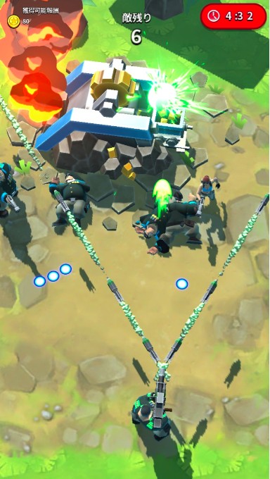 敵の島には、チームのメンバー4人で乗り込んでいきます。「LZ」と呼ばれるいくつかの上陸地点があるので、画面下に表示されている情報をチェックして、より効率的に稼げる「LZ」を選択しましょう。上陸すると早速戦闘がスタートします。攻撃は自動で繰り出されるので、スワイプで移動しながら敵の弾幕を避けていってくださいね。