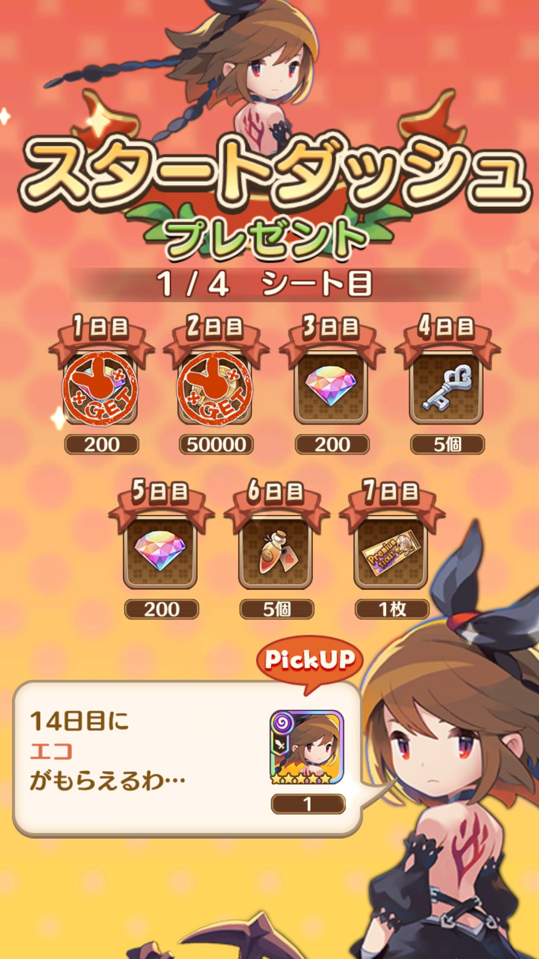 14日目に星5キャラクター エコがもらえます。
