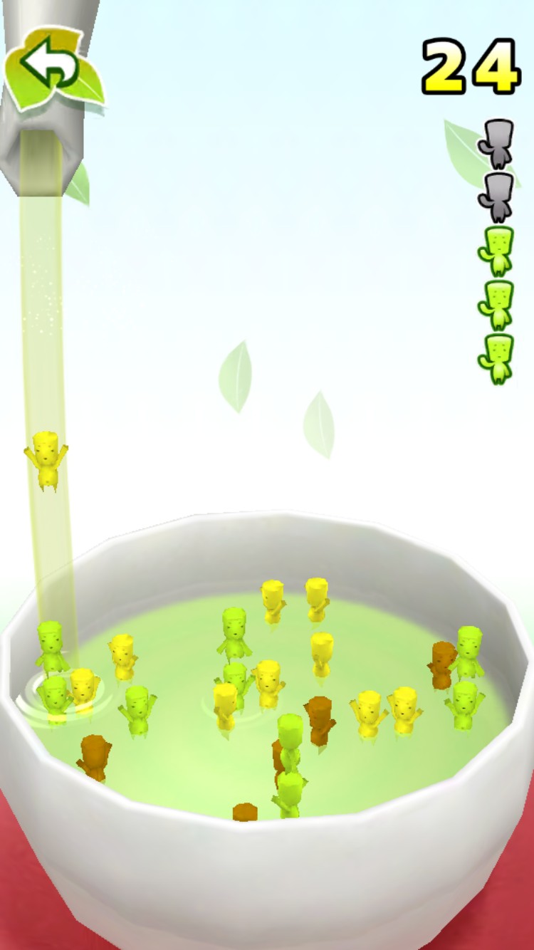 ふわふわした茶柱が空から降ってきますので、茶柱くんたちが沈まないように所せましとお茶の水面を均等に茶柱くんで埋めていきます。