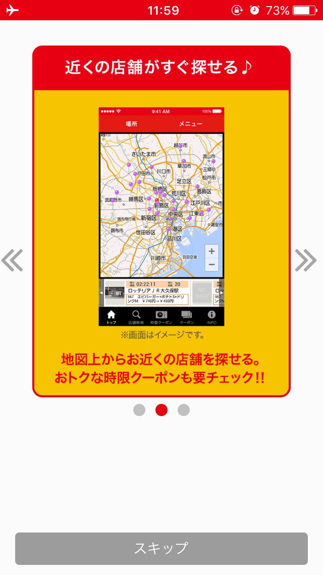 現在地周辺やお気に入り登録している店舗にて時限クーポンを発行している場合、早い者勝ちでクーポンをゲットできます。