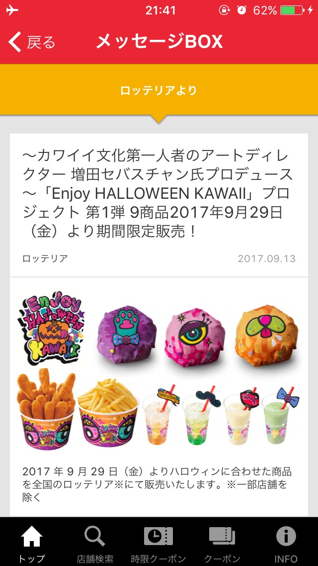 「ロッテリア公式アプリ」 メッセージBOXにてお得情報やキャンペーン情報を入手!